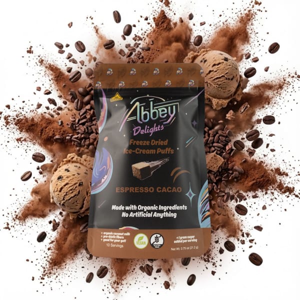 "Experience the magic of Abbey Delights with our melt-in-your mouth, cannabis infused, freeze dried ice-cream puffs. Each bite is crafted from organic ingredients, ensuring a clean, guilt-free indulgence that's out of this world."